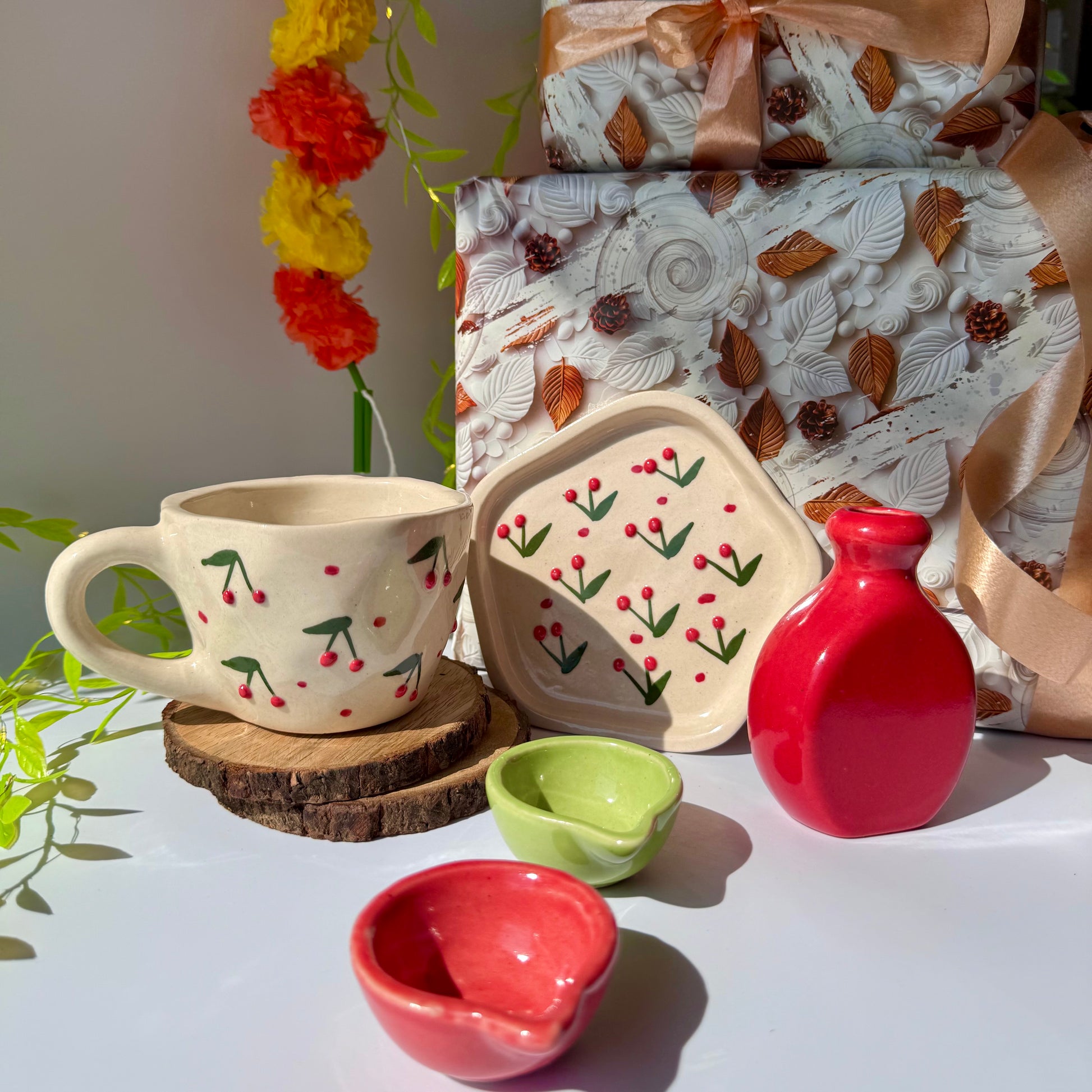 Celebrate the season of lights with a hamper that blends tradition and charm. This Diwali, gift a delightful set featuring a cherry cup and saucer set, a vibrant micro red vase, two elegant diyas, all beautifully gift-wrapped. Perfect for adding a touch of festive flair to any home!