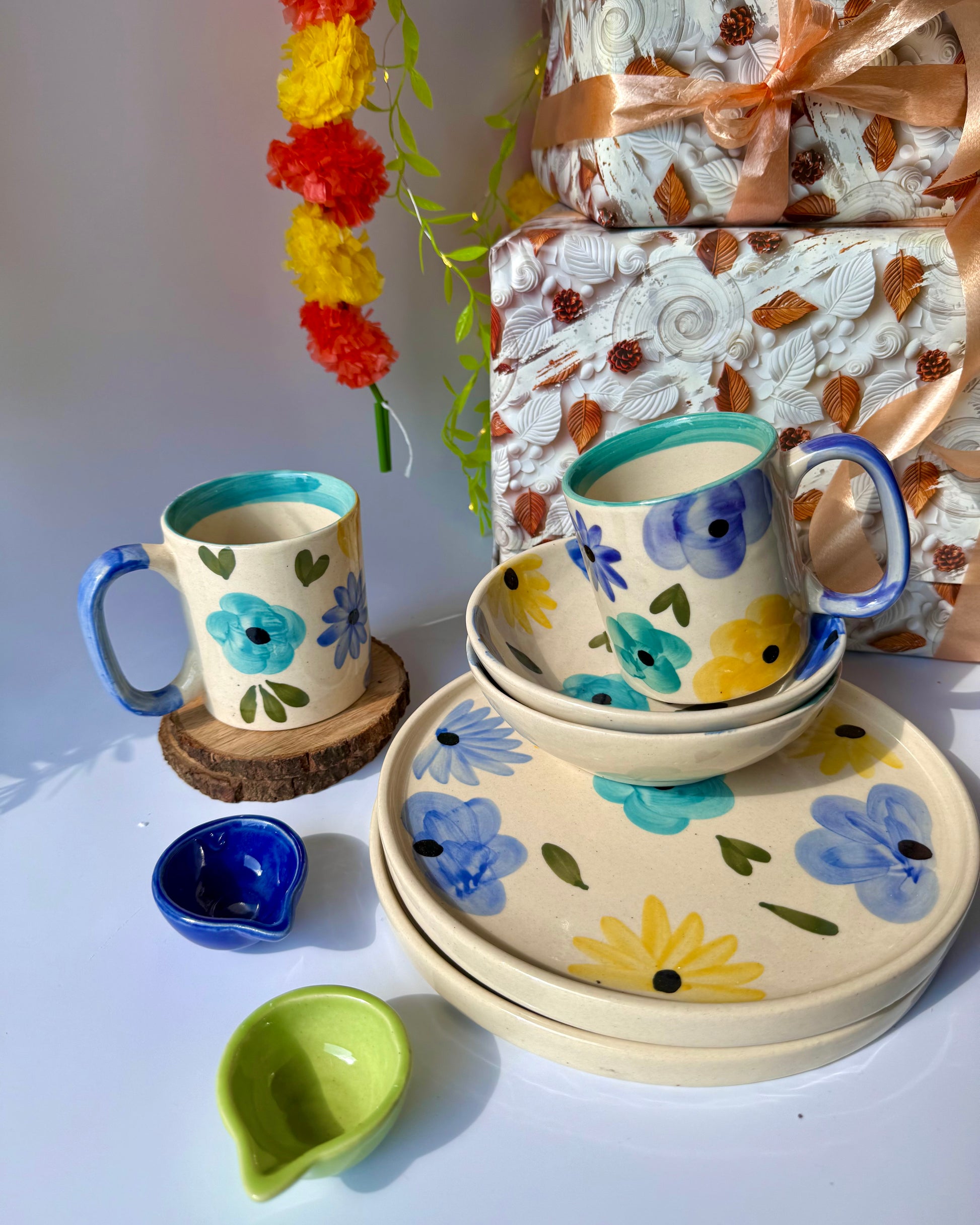 Bring the beauty of a blooming valley straight to your celebrations! This thoughtfully curated Diwali hamper includes 2 full sets (mug, plate & bowl each)—perfect for two!—along with 2 handcrafted diyas to light up the festive spirit. All beautifully gift-wrapped, it’s a vibrant, heartwarming present for loved ones (or yourself!). 🌼🪔